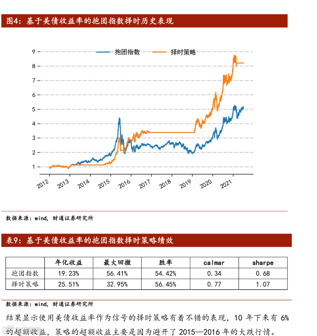 a) 通过美债收益率对抱团指数择时的策略2012年以来年化收益率达到25.51%,sharpe达到1.07。