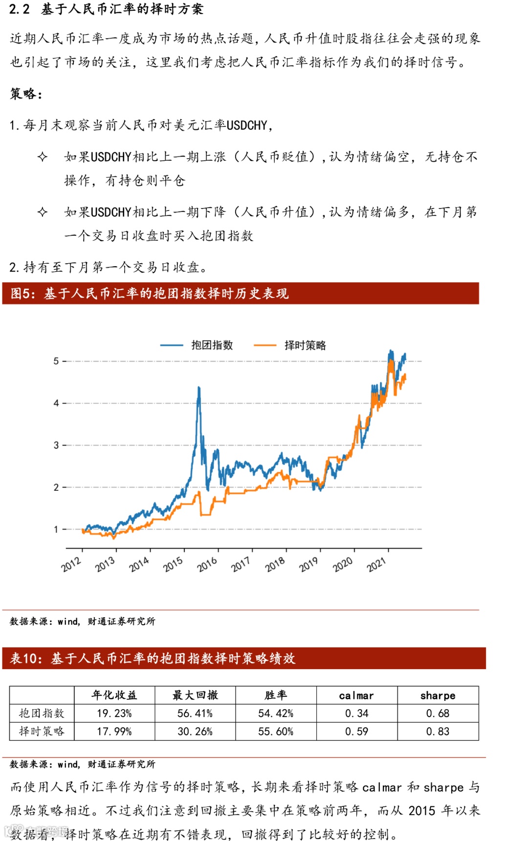 b) 通过人民币汇率对抱团指数择时的策略2012年以来年化收益率达到17.99%,sharpe达到0.83。