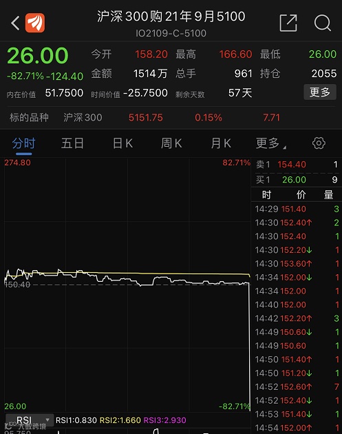 7月22日,沪深300指数收盘上涨0.15%,但沪深300指数期权9月看涨5100合约却出现诡异大跌。尾盘集合竞价时,该期权价格从152.2元瞬间跌至26元,跌幅高达82.71%。