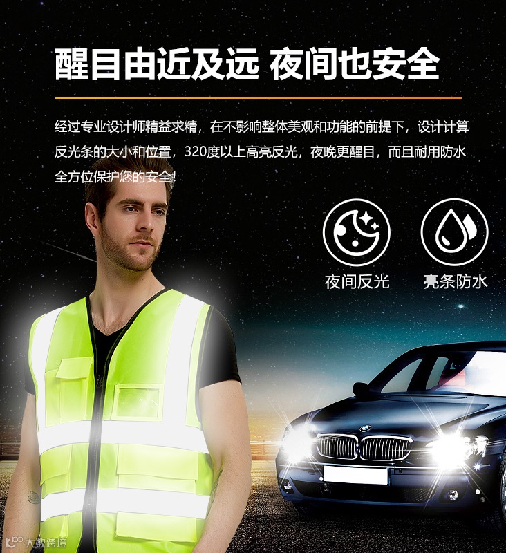 反光背心,在夜间或者特殊天气下会起到一个安全和警示作用。在日常中广泛应用在执行任务的交警,机场,停车场,救护,环卫,造船,石油等领域。