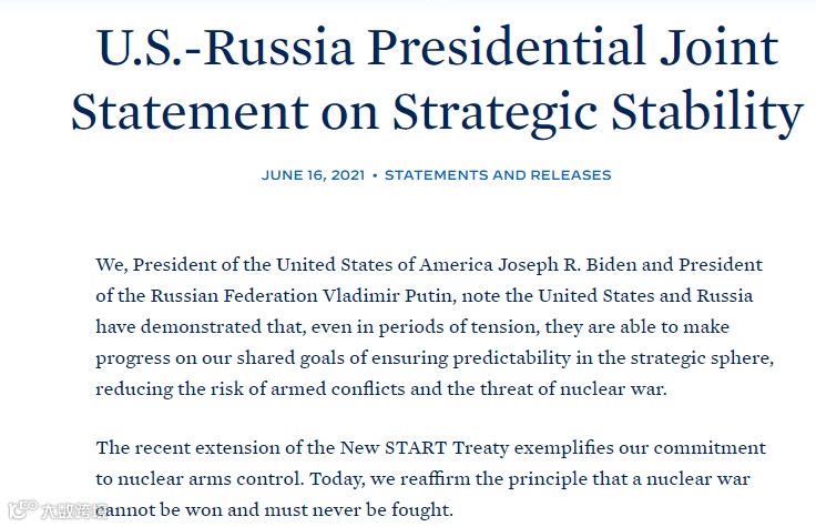 声明表示,美国总统拜登和俄罗斯联邦总统普京指出,美国和俄罗斯已经证明,即使在紧张时期,也能够在我们的共同目标上取得进展,即确保战略领域的可预测性,减少武装冲突的风险和核战争的威胁。