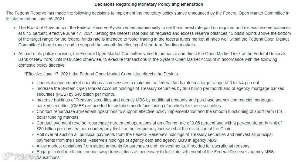 为落实联邦公开市场委员会在2021年6月16日的声明中宣布的货币政策立场,美联储做出以下决定: