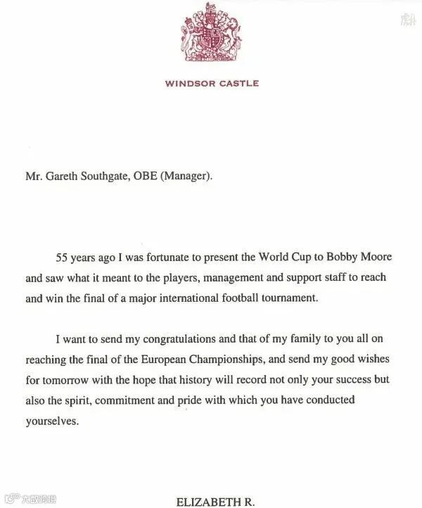 在欧洲杯决赛开始之前,英女王给索斯盖特写了一封信,鼓励索斯盖特:55年前我有幸将世界杯颁给了博比-摩尔,见证进入并且赢得重要国际足球赛事决赛对于球员、教练和后勤人员的意义。