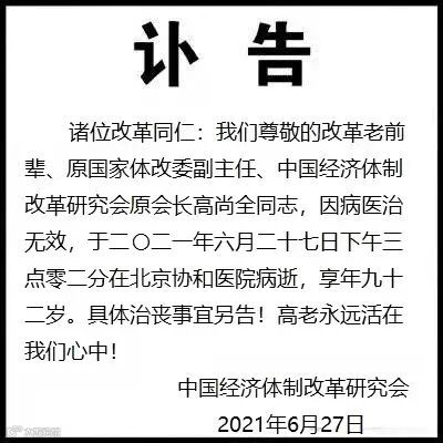 据中新网消息,6月27日,中国经济体制改革研究会发布讣告,原国家体改委副主任、中国经济体制改革研究会原会长高尚全同志,因病医治无效,于2021年6月27日下午三点零二分在北京协和医院病逝,享年九十二岁。