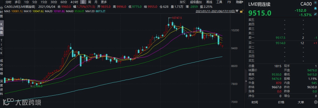 有色市场自5月中旬以来一直持续调整,美联储消息并没有对市场造成太大影响。以铜为例,截至记者发稿时,伦敦铜价格在9515美元/吨附近,比议息会议前价格下跌1%,较5月历史高点调整幅度已达11%。