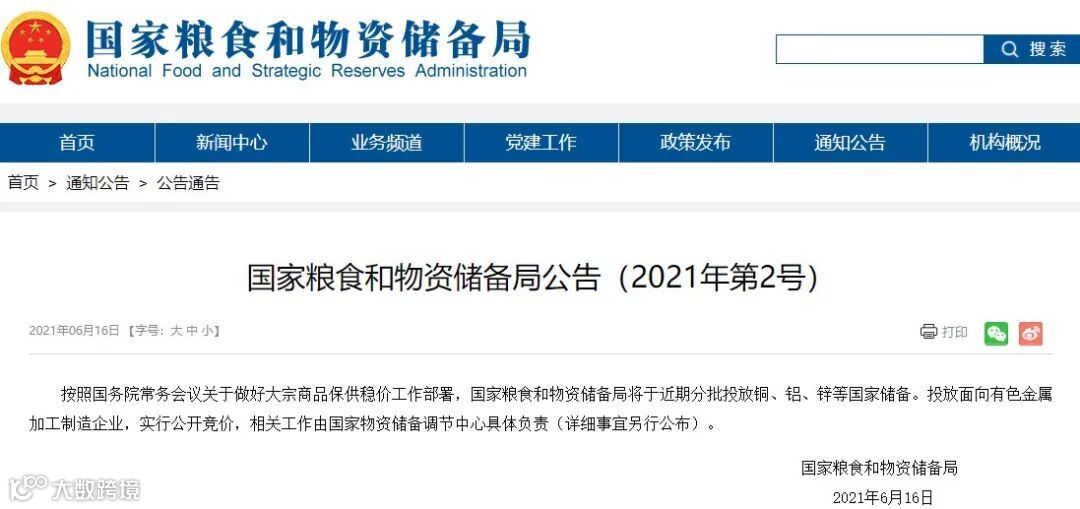 北京时间6月16日,国家粮食和物资储备局发布公告称,按照国务院常务会议关于做好大宗商品保供稳价工作部署,国家粮食和物资储备局将于近期分批投放铜、铝、锌等国家储备,投放面向有色金属加工制造企业,实行公开竞价。