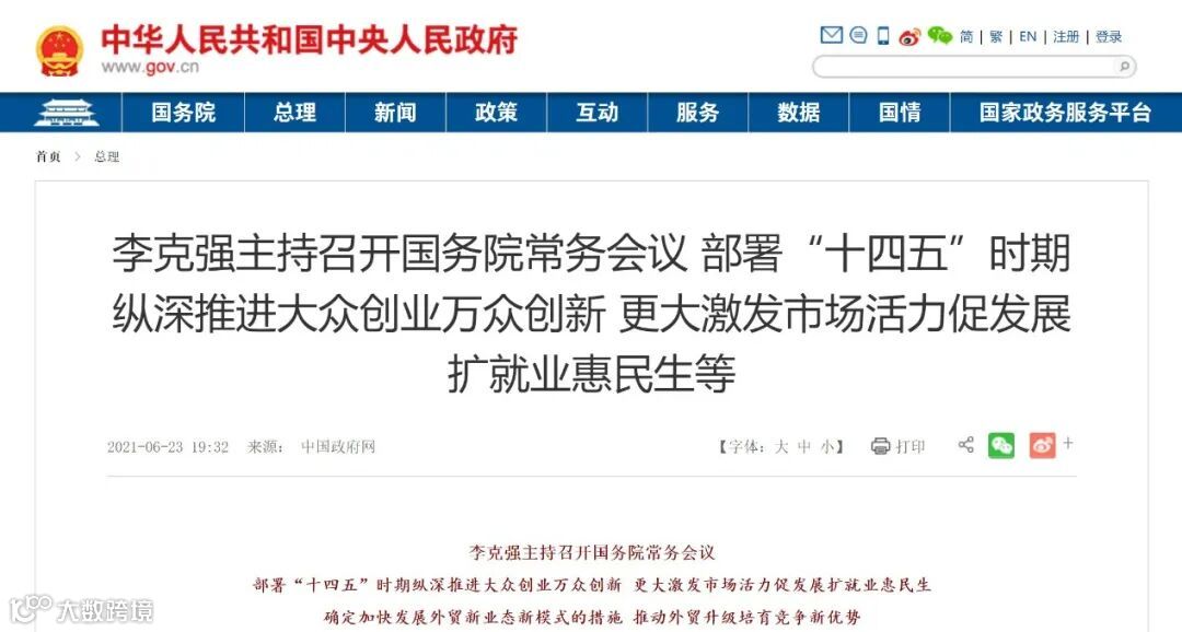 6月23日,国务院总理李克强主持召开国务院常务会议,部署“十四五”时期纵深推进大众创业万众创新,更大激发市场活力促发展、扩就业、惠民生;确定加快发展外贸新业态新模式的措施,推动外贸升级,培育竞争新优势。