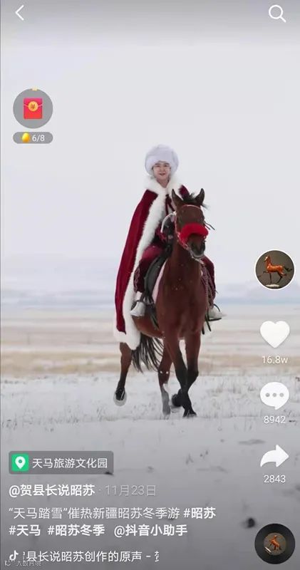 2020年11月,时任昭苏县副县长贺娇龙身着一袭红袍,策马雪原在网络上走红。报道,当时贺娇龙在抖音平台有超过80万粉丝,直播间的打赏收入也已经突破百万元,而这些打赏收入全部用于公益用途。