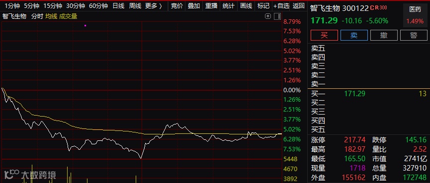 6月22日,A股持续活跃。截至收盘,三大指数皆以上涨收报。然而,在这种相对较为稳定的盘面背后,却有一只大牛股崩了。市值超过2700亿的疫苗巨头智飞生物盘中一度狂跌近9%,尾盘仍以杀跌近6%收报。在广东疫情形势较为严峻,英国疫情出现第三波,美国疫情可能再度恶化的背景之下,疫苗股龙头突然杀跌究竟是何缘故?