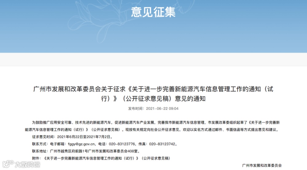 日前,广州市发改委发布《关于进一步完善新能源汽车信息管理工作的通知(试行)》(征求意见稿)。根据该通知,今后广州市消费者购买新能源车上绿色号牌需要先获得市发改委发放的《广州市新能源汽车信息管理凭证》(下称“凭证”)和新能源汽车指标等相关材料。需要注意的是,此通知仅为公开征求意见稿,意味着广州市就此政策展开意见征集。