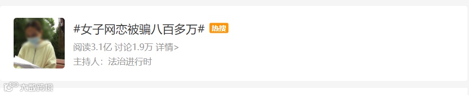 近日,“女子网恋被骗800多万”一事冲上微博热搜前三。事主张女士被在婚恋网站认识的“男友”诈骗了824万后,对方消失。
