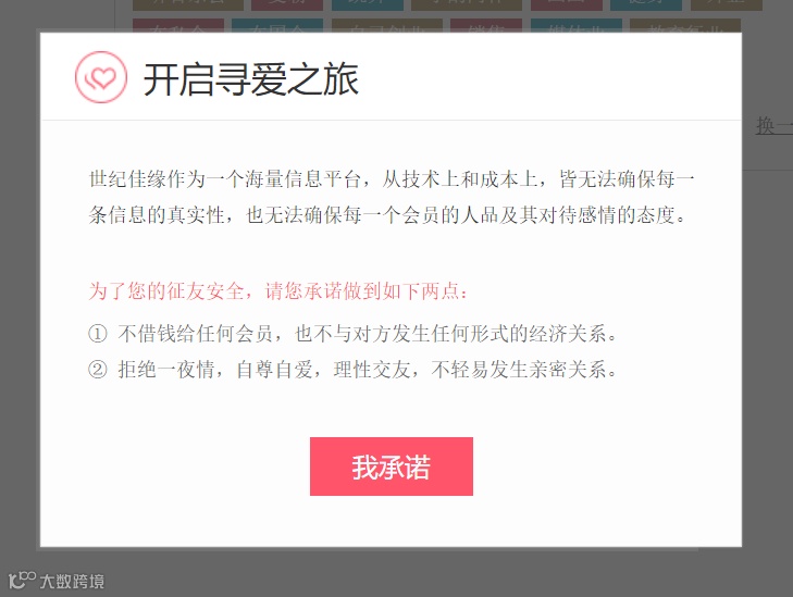 此外,该人士表示,为了避免用户被骗,世纪佳缘聊天对话框都是实时弹出警示信息的,但是如果交友行为脱离了该网站,其无法尽到提示义务。