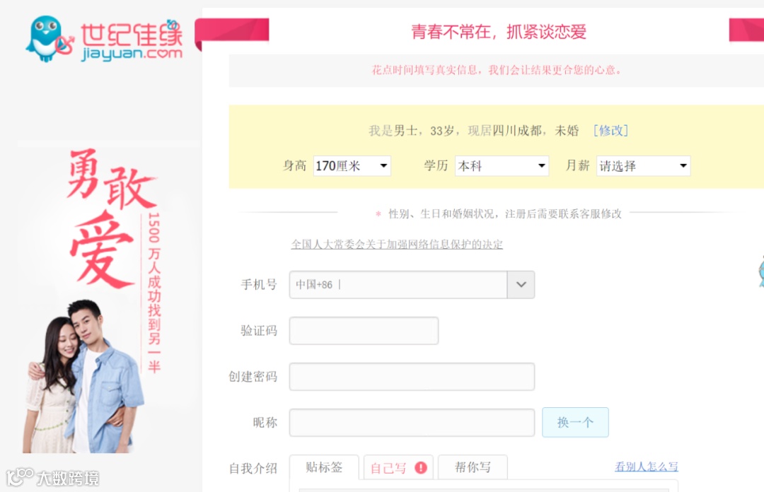 《每日经济新闻》记者也体验了世纪佳缘的注册过程,首先在该婚恋网站首页填写性别、生日、所在地和婚姻状况,然后进入注册页面填写身高、学历、月薪等信息,随后输入手机号并进行验证,最后取一个昵称,此外并不需要提供其他信息。