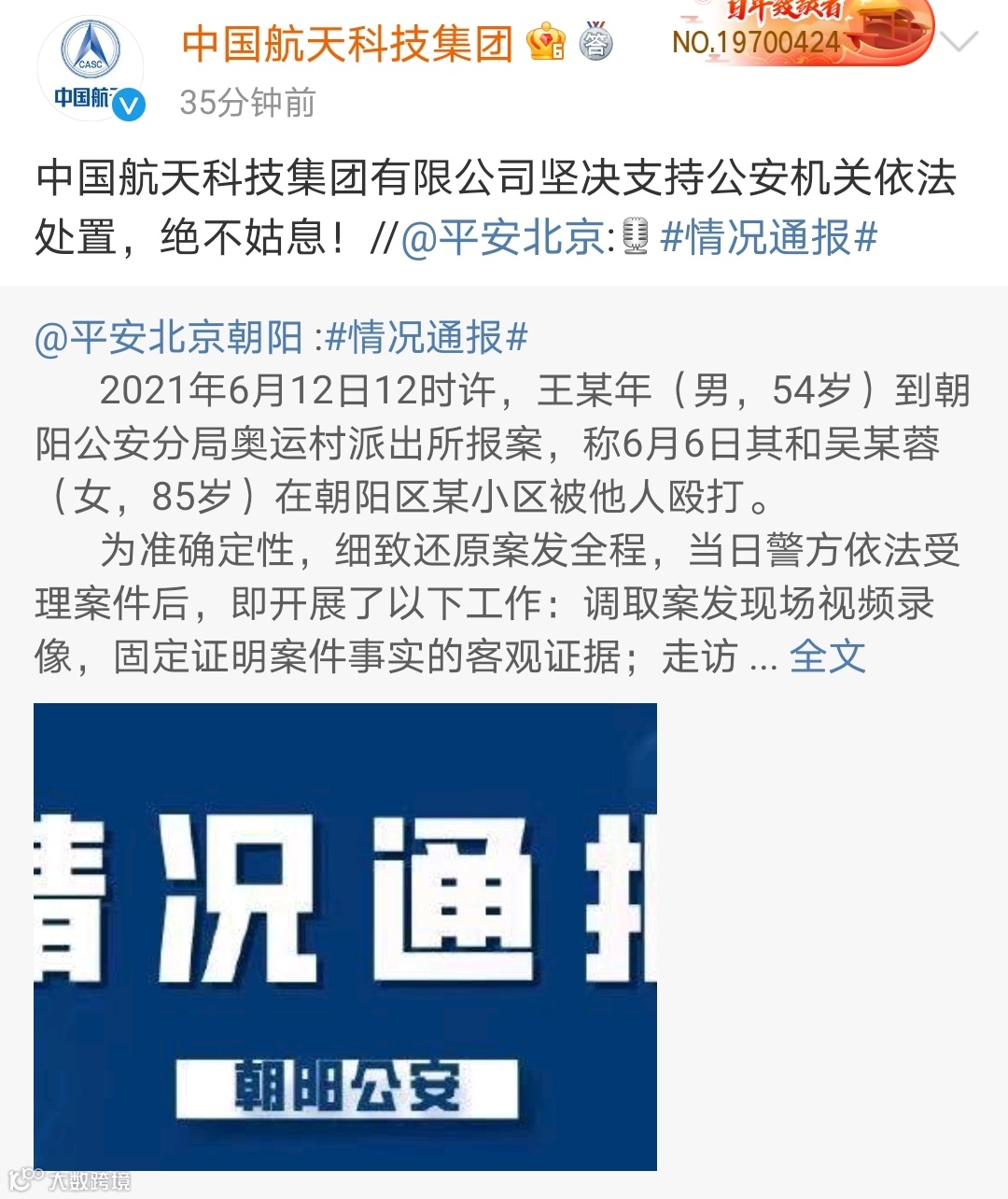 7月5日,中国航天科技集团回应:坚决支持公安机关依法处置,绝不姑息。