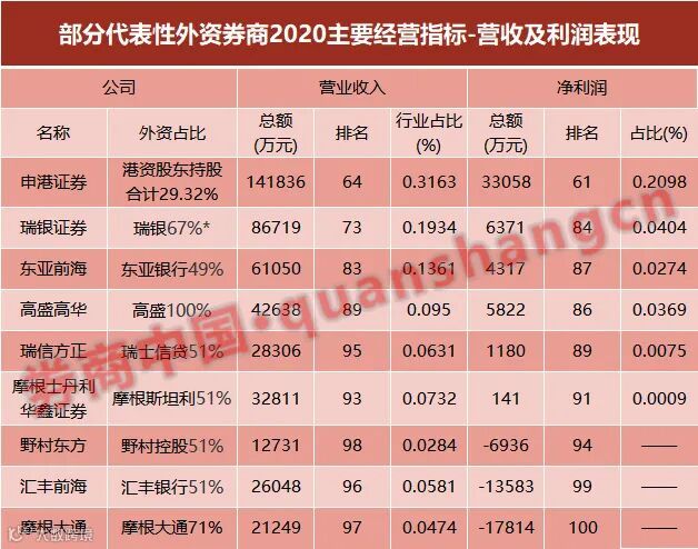 但外资面临的挑战不可谓不大。根据中国证券业协会最新公布的《证券公司2020年经营业绩指标排名情况》,2020年各家外资券商在全行业的营收占比均处低位,对应的净利润占比则更低,有数家仍现亏损。