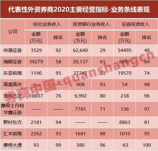 如再切入各主要业务条线的经营及排名情况,则可以看到,除申港的投资银行业务收入进入行业前30、证券投资收入进入中位数行列,瑞银受益于代理机构客户买卖证券的巨量优势从而在经纪业务线进入中位数行列,东亚前海因为2020年投行业务表现上升(主要是债券业务)从而在投资银行业务上进入中位数行列,其他代表性外资券商的业务表现及相应市场份额均排名靠后。