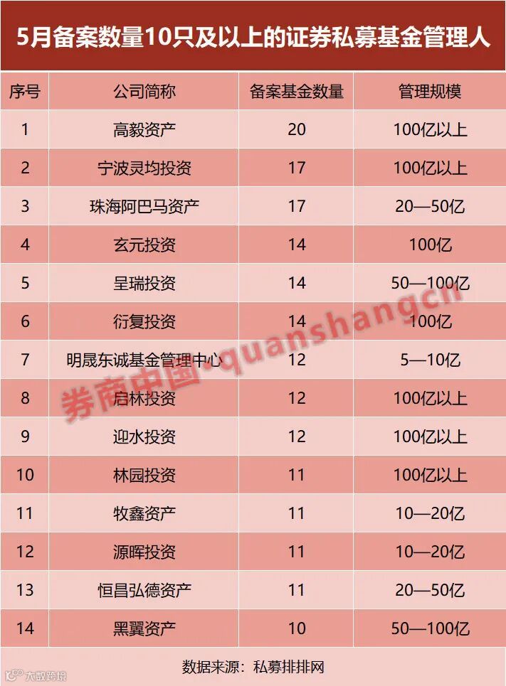 其中,高毅资产单月备案了20只基金,位居第一;灵均投资、阿巴马资产备案17只产品,排名第二;玄元投资、衍复投资、呈瑞投资以14只产品排名4-6位。