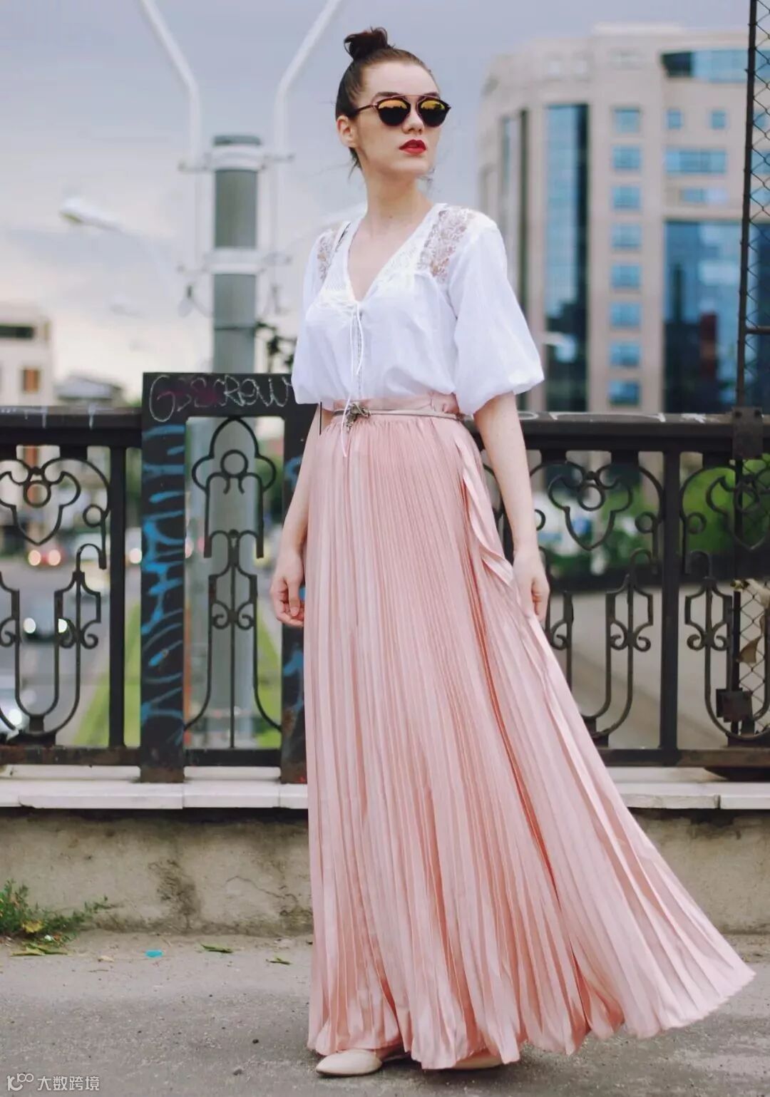 用白色的上衣搭配粉色下装,甜美可人又很显气色。
