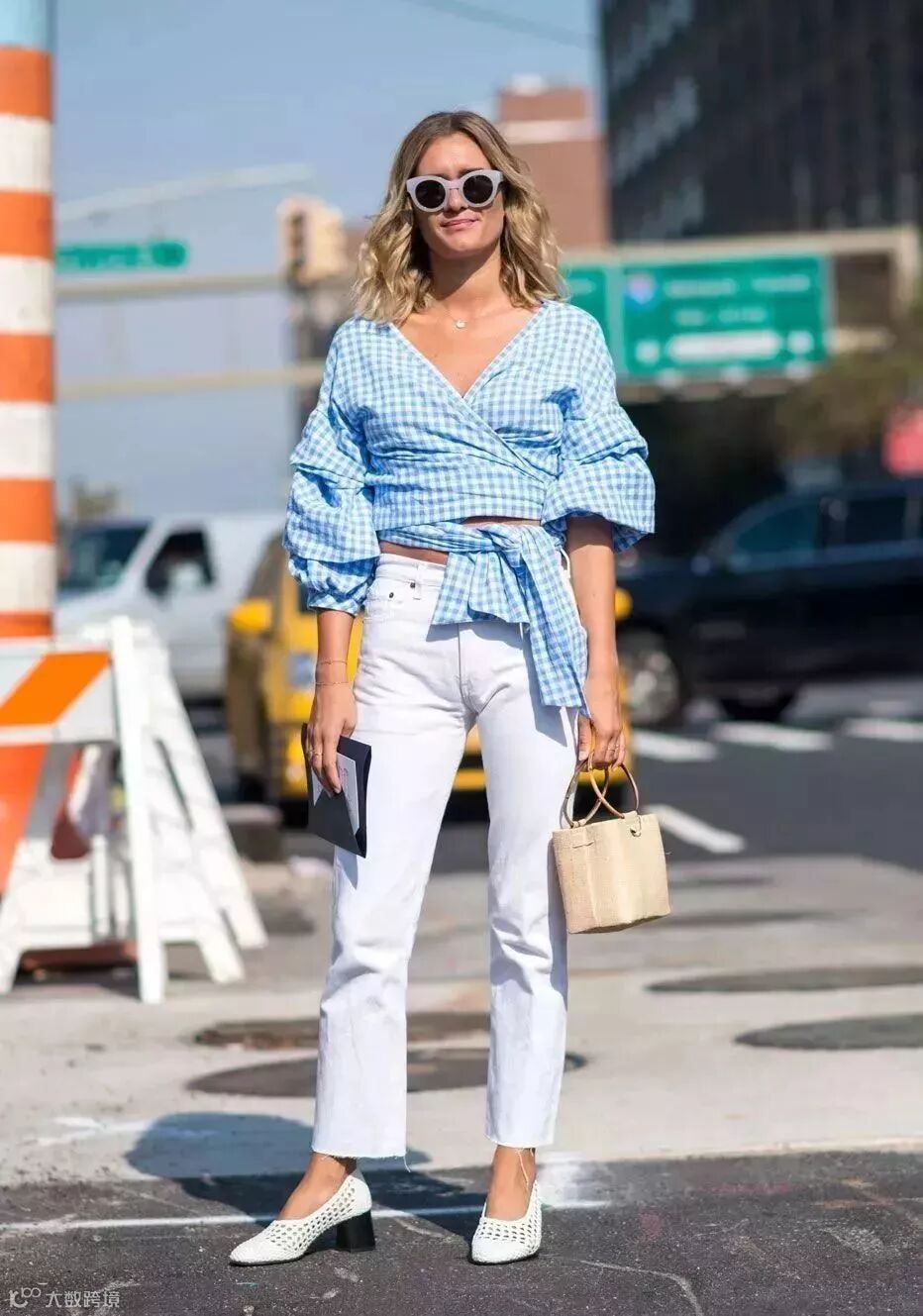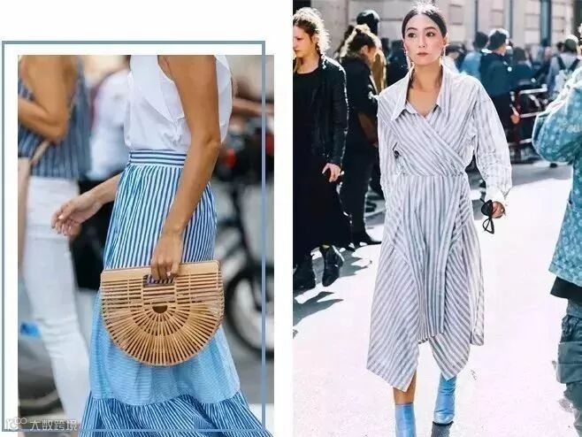 蓝白配除了是上下装搭配之外,还可以是这样蓝白条纹look,摩登随性,时髦度满分!
