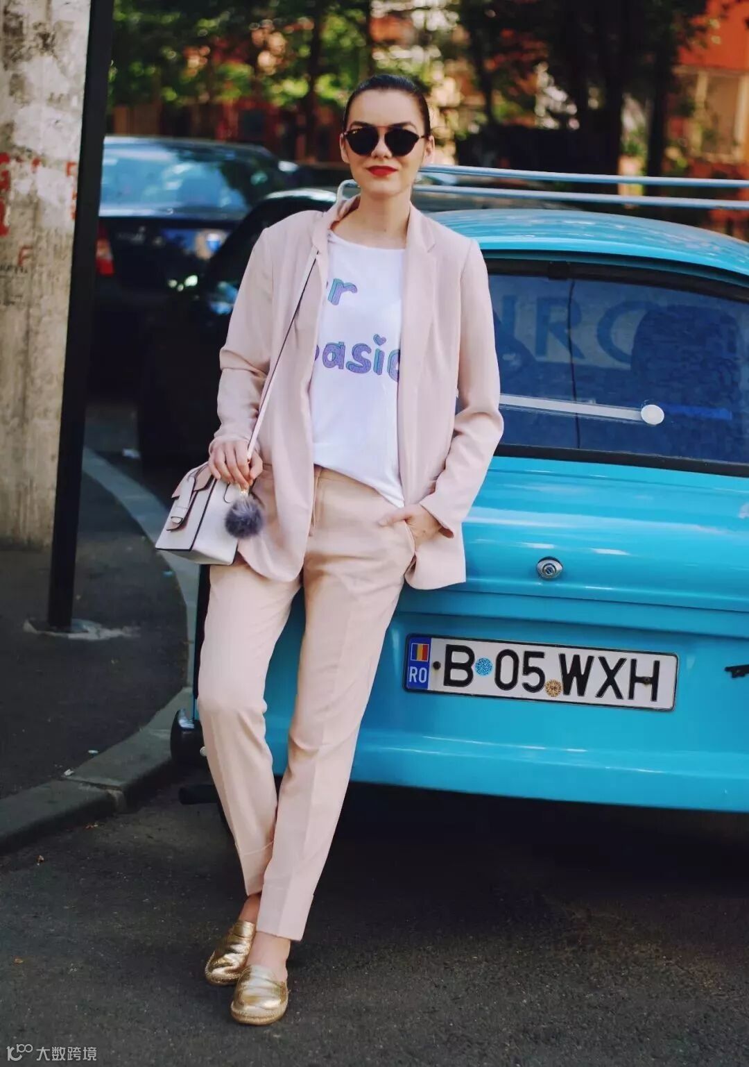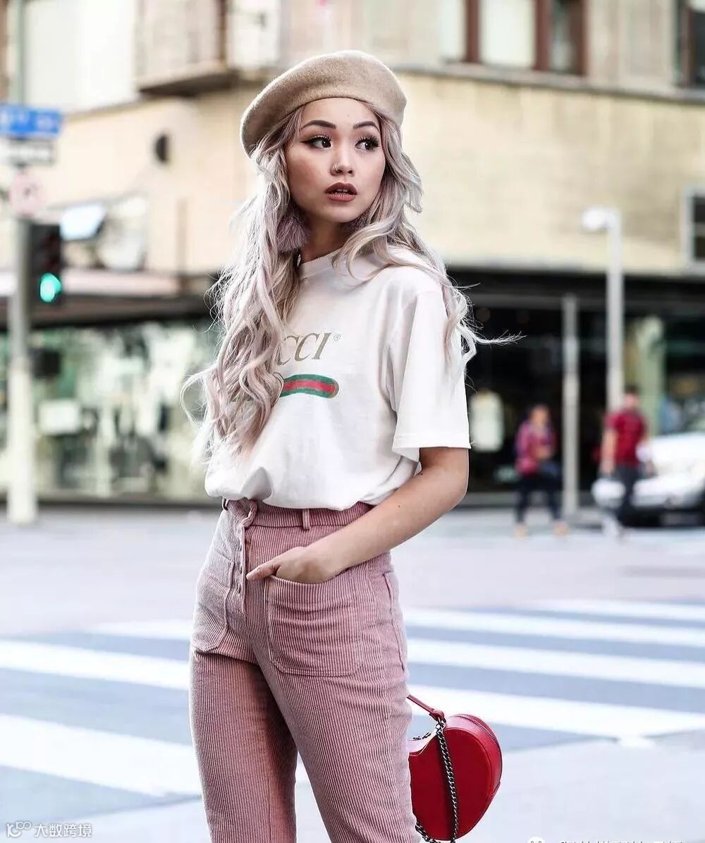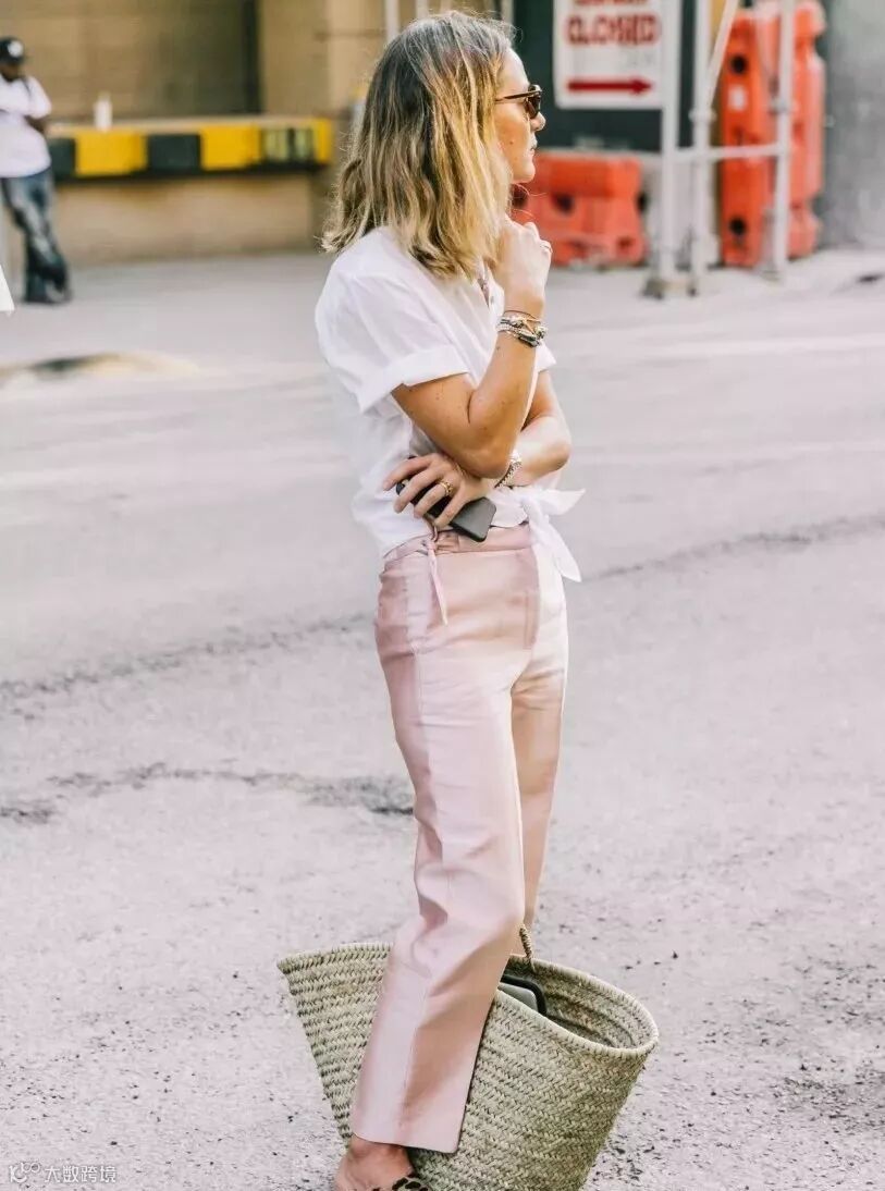 粉色的裤装look又美又帅,上衣只需搭配白T恤就很chic了。