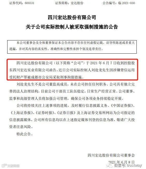 7日下午,宏达股份(600331.SH)公告,公司于2021年6月7日收到控股股东四川宏达实业有限公司函告,近日公司实际控制人刘沧龙先生因涉嫌背信运用受托财产罪被成都市公安局采取刑事拘留措施。