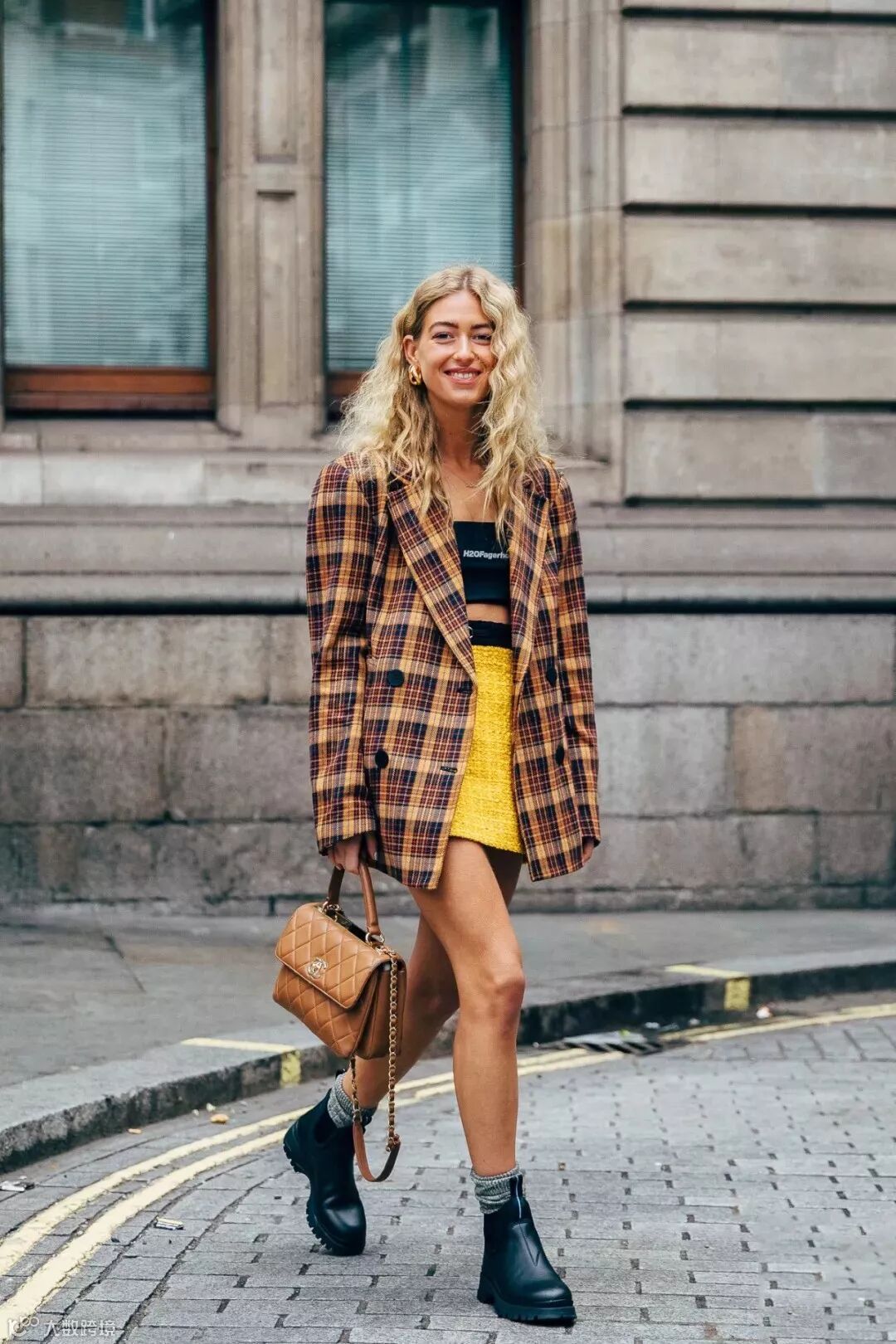 带有中性美的格纹西装搭配裙子和高筒靴,休闲和气场同时拥有。
