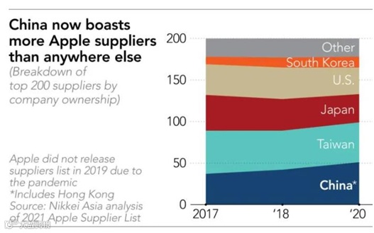 苹果公司作为消费电子行业的风向标,打造多元化制造体系是公司长期实施的战略。在其最新发布的2020财年供应商名单中也可看到产业迁移迹象:一方面,中国大陆供应商(含中国香港)达到51家,历史首次超过了中国台湾供应商数量;另一方面,苹果供应商在越南设厂数量从2018年财年的14家增加至21家,甚至是同期印度厂商数量两倍。