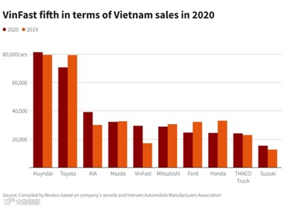 Vinfast系越南最大的综合企业集团Vingroup旗下汽车子公司,也是越南首家汽车制造商,在去年已经成为越南第五大汽车品牌,并计划赴美上市,最新估值超过500亿美元,直逼蔚来汽车。