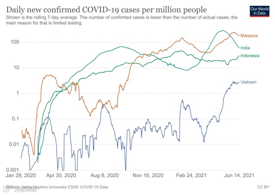 截至2021年6月14日马拉西亚,印度,印度尼西亚、越南新冠疫情新确认病例数据单位每百万人口数据来源:Our World in Data