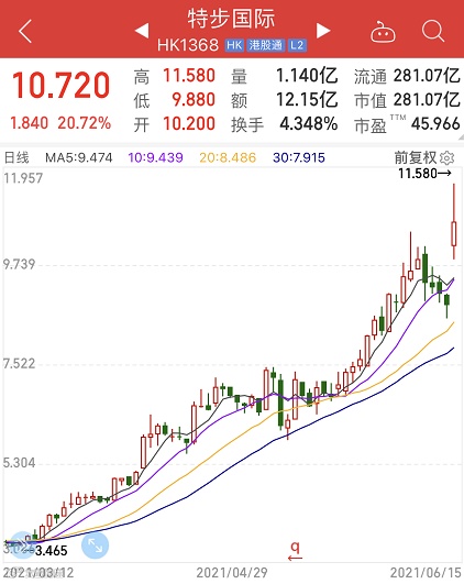 即高瓴此番投资特步的总金额超过了10亿港元。受此消息刺激,特步股价暴涨,早盘高开近15%,盘中一度大涨30%。截至收盘,特步国际收涨20.72%。