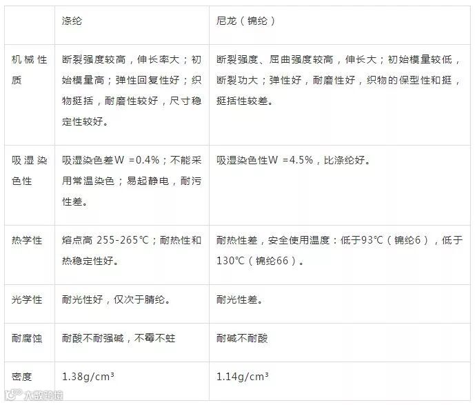 锦纶一般弹性较好!染色温度在100度就可以了!用中性或酸性染料染色。耐高比涤纶要差,但是他的强力要好,抗起球好!染色温度130度(高温高压),热熔法一般在200度以下烘培!涤纶主要特点稳定性要好,一般衣服里加少量的涤纶可以帮助抗皱,塑性,缺点就是易起静电易起球。不过现在改良的涤纶这些缺点都有改善。