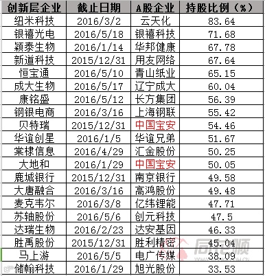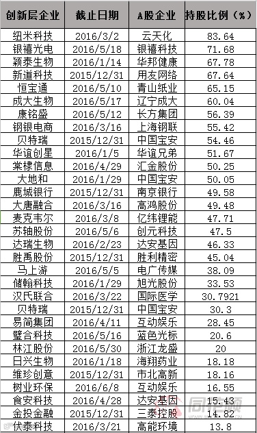 73家A股持有282家创新层企业股份,19家A股控股20家创新层企业,其中中国宝安(000009)控股2家创新层企业,分别是贝特瑞和大地和,成为控股创新层企业最多的A股公司。