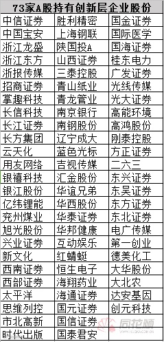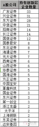 从持有创新层企业数量来看,广发证券(000776)是最大赢家,共持有33家创新层企业的股份;持有超过2家(含2家)创新层企业的A股公司有26家。
