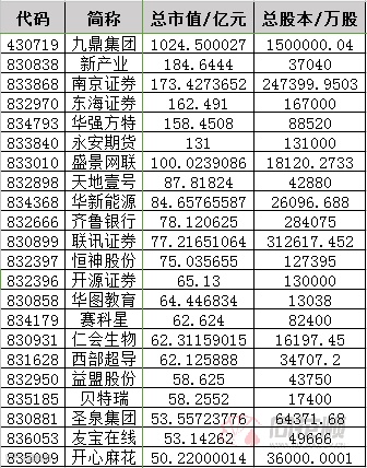 3、创新层平均市值10.26亿,九鼎集团超千亿