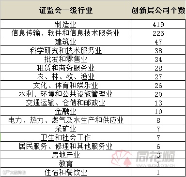 共有419家创新层企业属于制造业,占比45.5%,软件和信息技术产业有225家,占比24.5%,这两大行业占比总计70%。