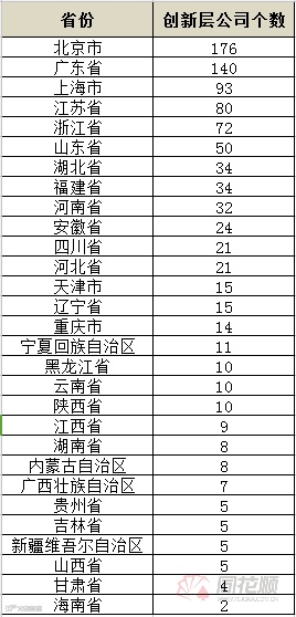 920家创新层企业分布在全国29个省市,其中北京、广东、上海进入创新层的数量位列前三甲,分别为176、140、93家;而且仅这三省市进入创新层数量的占比就达到了44.46%。