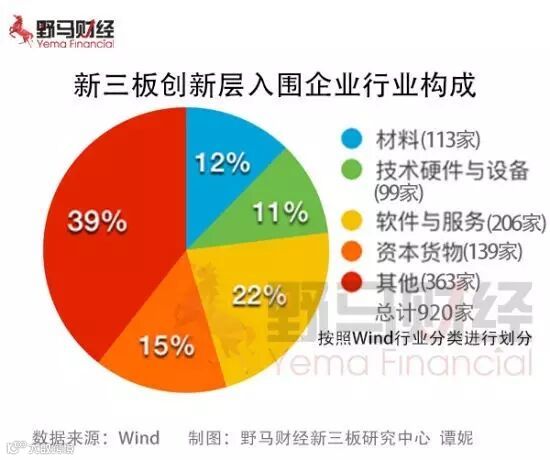 6月18日,股转系统发布了创新层公司初步筛选名单,共计920家企业入围。据野马财经新三板研究中心统计,其中,材料、技术硬件与设备、软件与服务及资本货物四大行业即占据了61%的席位,剩下二十个行业仅共计入围363家企业。
