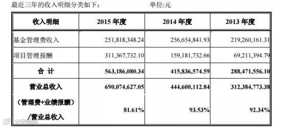 例如,关于第一条“管理费收入与业绩报酬之和须占收入来源的 80%以上”的要求,九鼎集团给出了最近三年收入明细:
