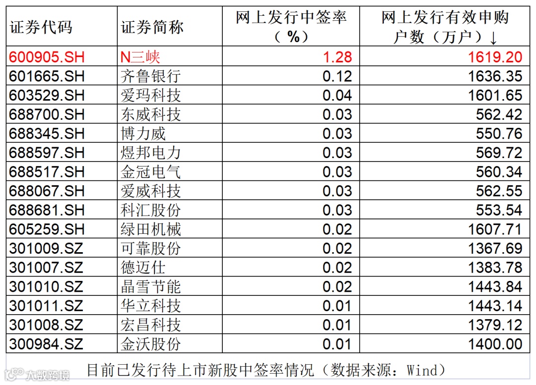 另外,从此次高达近1.3万亿元的申购规模来看,打新热情还是比较高。投资者无论是看上了三峡能源的中签率高,还是看上了背后的碳中和这个概念,都还是对上市后的表现有所期待。