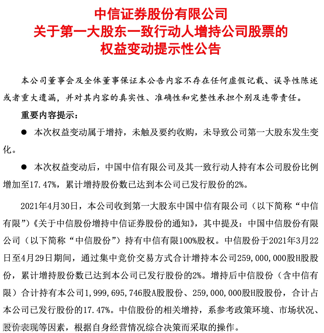 中信证券5月1日曾公告,中信股份早在3月22日起就开始了此轮增持动作,截至4月30日,中信股份合计持有中信证券约20亿股A股股份、2.59亿股H股股份,合计占中信证券已发行股份的17.47%。