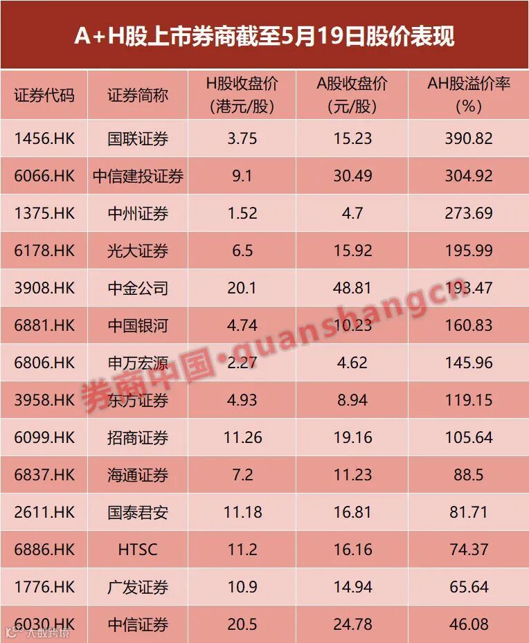 在此期间,中信证券H股股价表现颇为可观,从3月19日收盘价15.58港元一路节节攀升,截至5月18日收盘(5月19日港股佛诞日休市一天)已达到20.5港元,区间累计涨幅达到了31.58%。值得注意的是,中信证券5月19日收盘的AH股溢价率为46.08%,在14家A+H股上市券商中价差最小,而国联证券、中信建投、中州证券等AH股溢价率甚至超过200%。