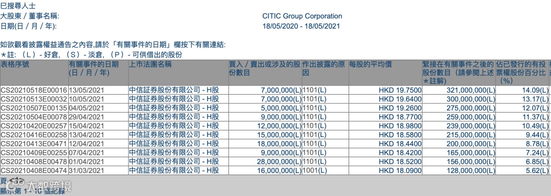 由于港交所只披露持股达到H股股份的5%之后,每向上或者向下跨过1%的那笔交易,因此更多的信息还要从中信证券公告中了解。
