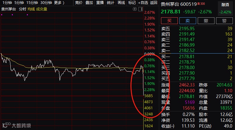 然而,最吸引眼球的还是各大权重股尾盘的表现。多只大盘股尾盘集合竞价出现大幅波动。贵州茅台集合竞价被砸1.72%,市值损失接近500亿元。山西汾酒、酒鬼酒均被砸超过2.5%,石头科技、金山办公等皆被砸。