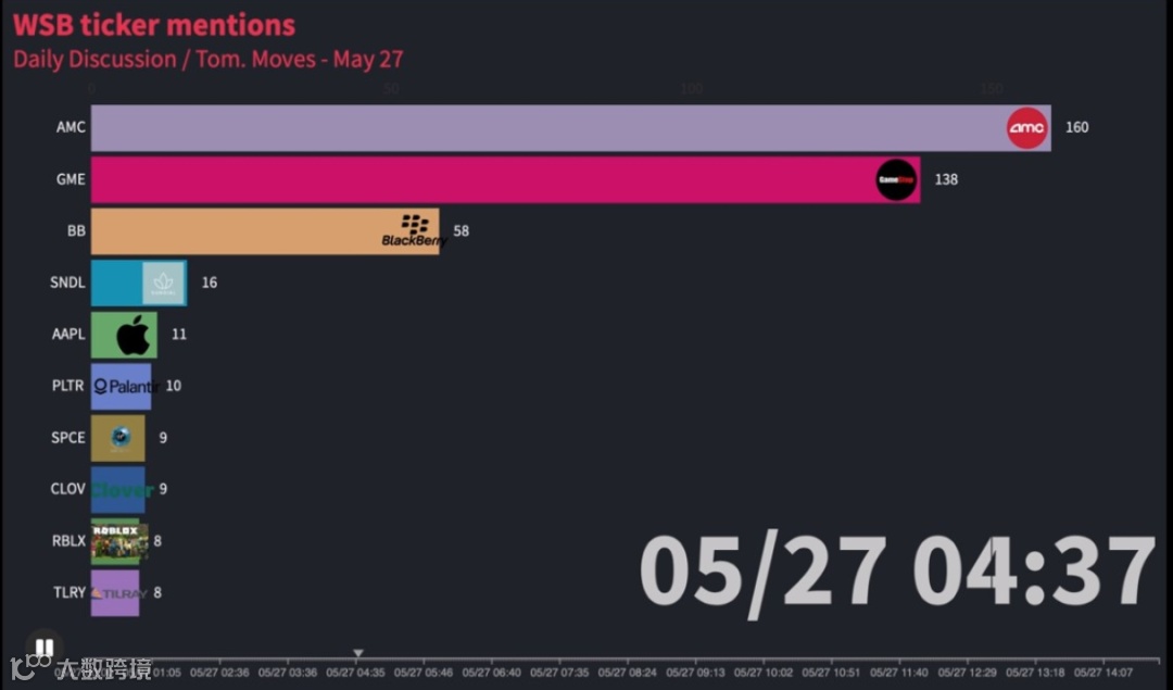 而AMC院线股价疯涨的背后推手,或许仍然是美国散户。5月以来,号称美国“散户大本营”的WSB论坛中,关于AMC院线的讨论最为激烈,声势已明显高过此前的“带头大哥”GME,成为了美国散户最受喜爱的股票。