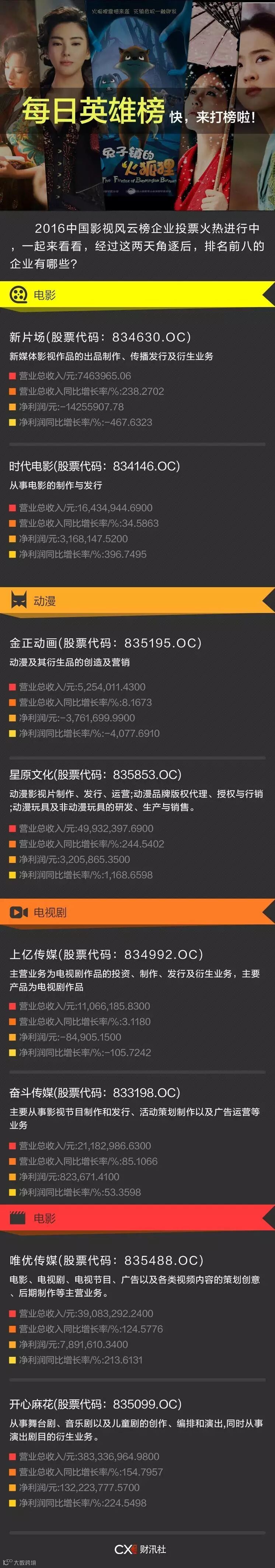 截止到今天14:30,2016年中国新三板影视风云榜投票排名已然发生了改变,社掌发现目前受关注度最多是影视周边领域的“唯优传媒”,主营电影、电视剧、电视节目、广告以及各类视频内容的策划创意、后期制作等业务。