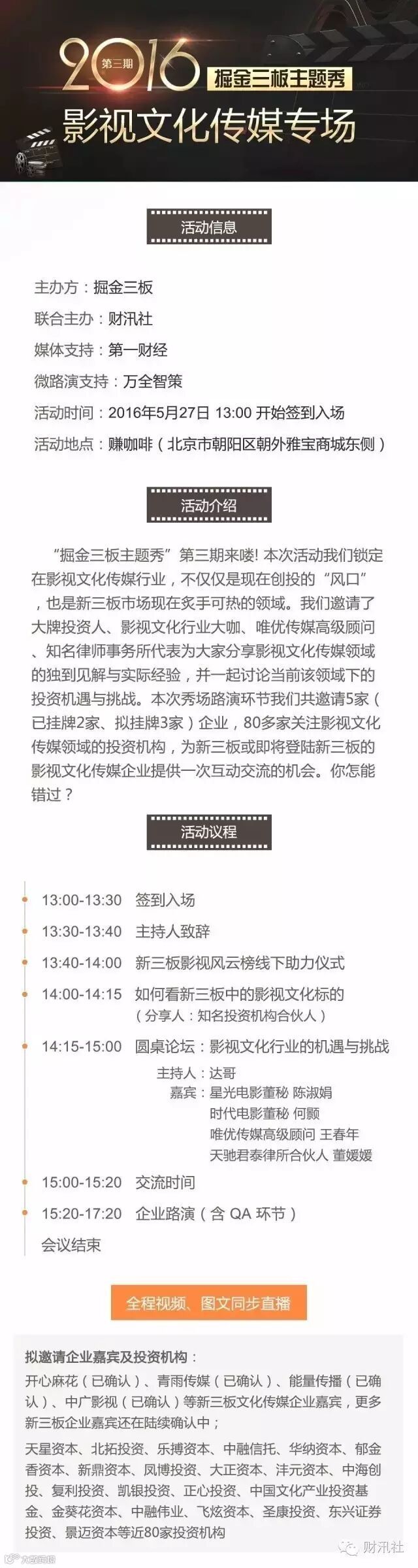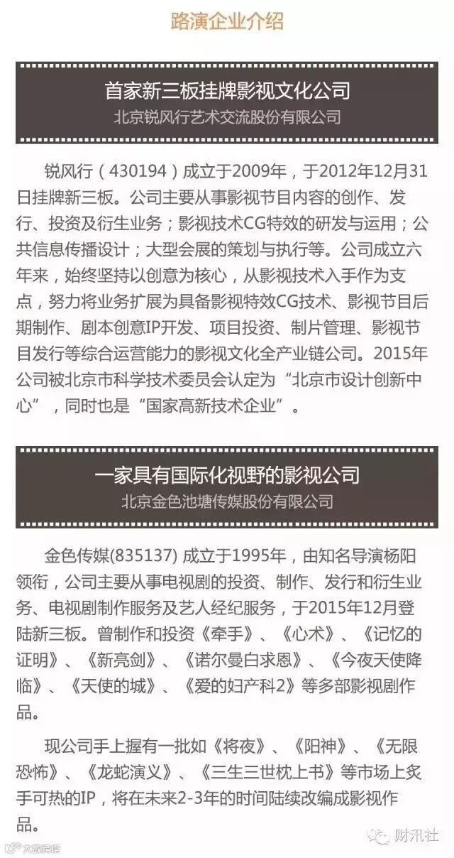“掘金三板主题秀”第三期来喽!本次活动我们锁定在影视文化传媒行业,不仅仅是现在创投的“风口”,也是新三板市场现在炙手可热的领域。所以这样优质活动,你怎能错过!