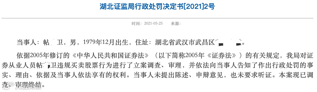 同时,湖北证监局则同步更新了两份行政处罚决定书,曝光了两名证券分支机构老总的违规交易股票案,其中一名证券分公司负责人炒股一年亏掉41.2万元,此次罚款20万元;另一名证券营业部副总虽炒股5年半,累计赚了97万元,但扣除120万两融利息,这位老总非但没有赚钱,最后还被罚一没一194万元。