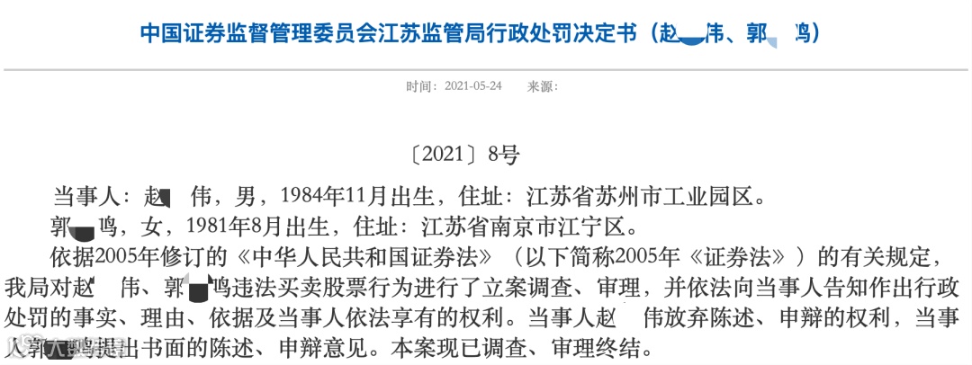 尽管郭某鸣提出,荣某某账户一直系其父亲操作,期间曾交由赵某伟操作,她本人从未控制过荣某某账户。但江苏证监局根据当事人询问笔录、荣某某账户交易记录等认定郭某鸣操作荣某某账户的事实清楚、证据确凿,故对上述申辩意见不予采纳。最终决定对赵某伟、郭某鸣分别处以2万元罚款。