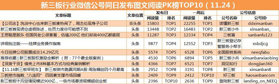 国内首家专业的新三板数字化投融传播平台——财汛社的运营团队(人称“社掌”),于2015年11月20日起推出独家特色产品——新三板行业微信公号同日发布图文阅读PK榜TOP10。