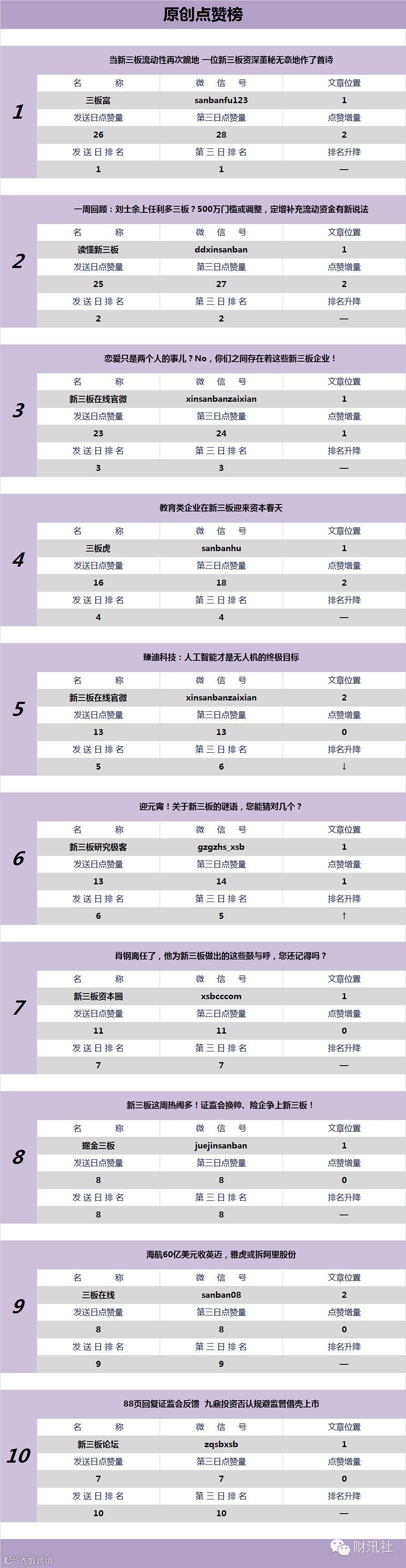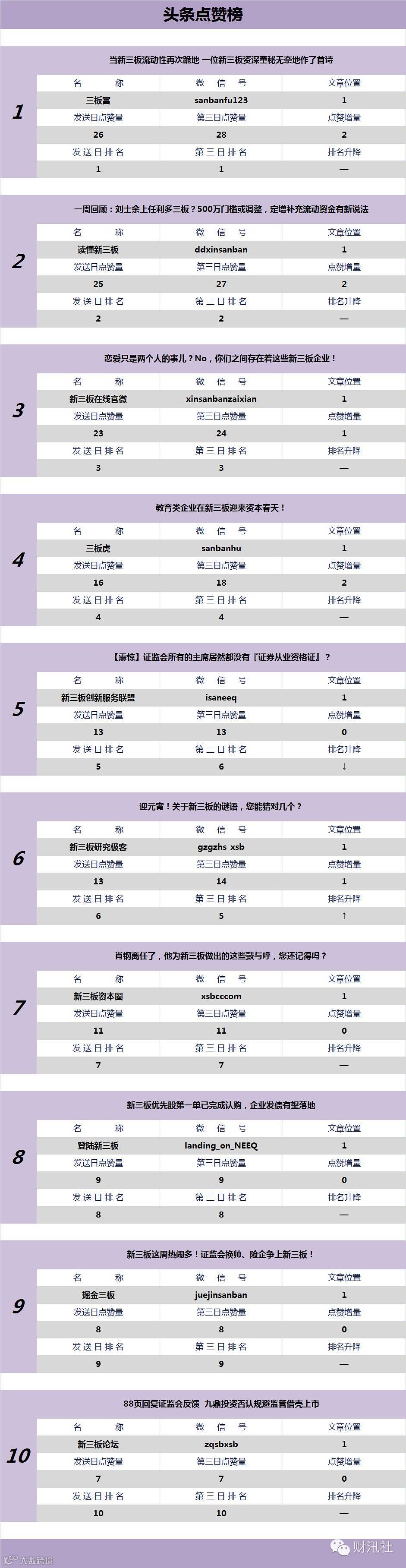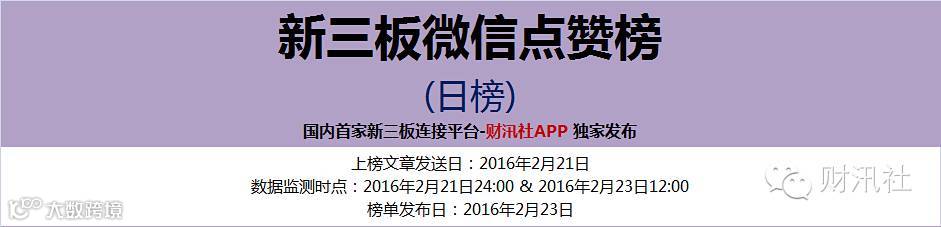 《新三板微信点赞榜(日榜)》今日发布第3期。由【财汛社APP】官方订阅号@财汛社(微信号:caixunshe)首发。